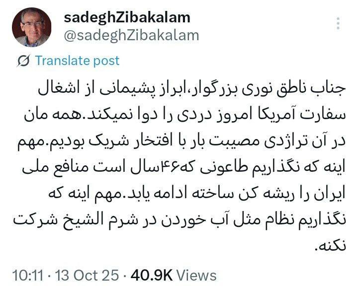 به گزارش گیل و دیلم ، صادق زیباکلام در توئیتی نوشت: جناب ناطق نوری بزرگوار، ابراز پشیمانی از اشغال سفارت آمریکا امروز دردی را دوا نمیکند.
