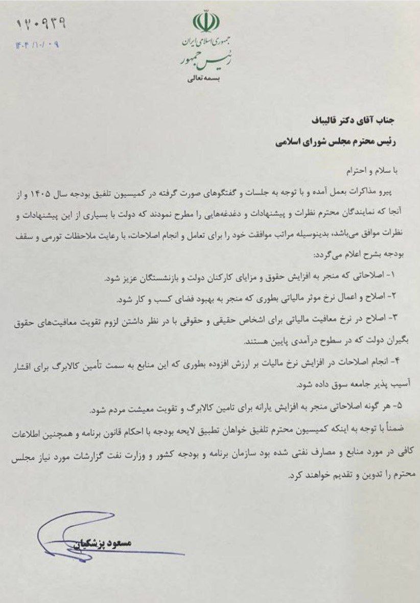 پیرو مذاکرات به عمل آمده و با توجه به جلسات و گفتوگوهای صورت گرفته در کمیسیون تلفیق بودجه سال ۱۴۰۵ و از آنجا که نمایندگان محترم نظرات و پیشنهادات و دغدغههایی را مطرح نمودند که دولت با بسیاری از این پیشنهادات و نظرات موافق میباشد، بدین وسیله مراتب موافقت خود را با تعامل و انجام اصلاحات با رعایت ملاحظات تورمی و سقف بودجه بشرح اعلام میگردد: